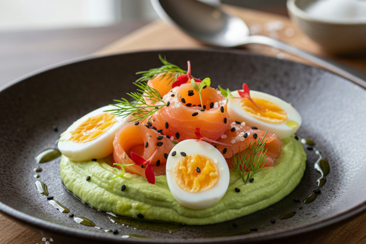 Una volta pronta la base di avocado, il passo successivo è l’aggiunta del salmone affumicato. Il salmone viene tagliato a striscioline sottili e disposto delicatamente sopra la mousse. L’affumicatura del salmone introduce una nota di sapidità e complessità che contrasta piacevolmente con la freschezza dell’avocado. Segue l’aggiunta delle uova di quaglia, che vengono prima sode e poi tagliate a metà. Le uova di quaglia non solo arricchiscono il piatto dal punto di vista visivo con il loro colore intenso, ma offrono anche una texture unica che si sposa bene con la cremosità della mousse.